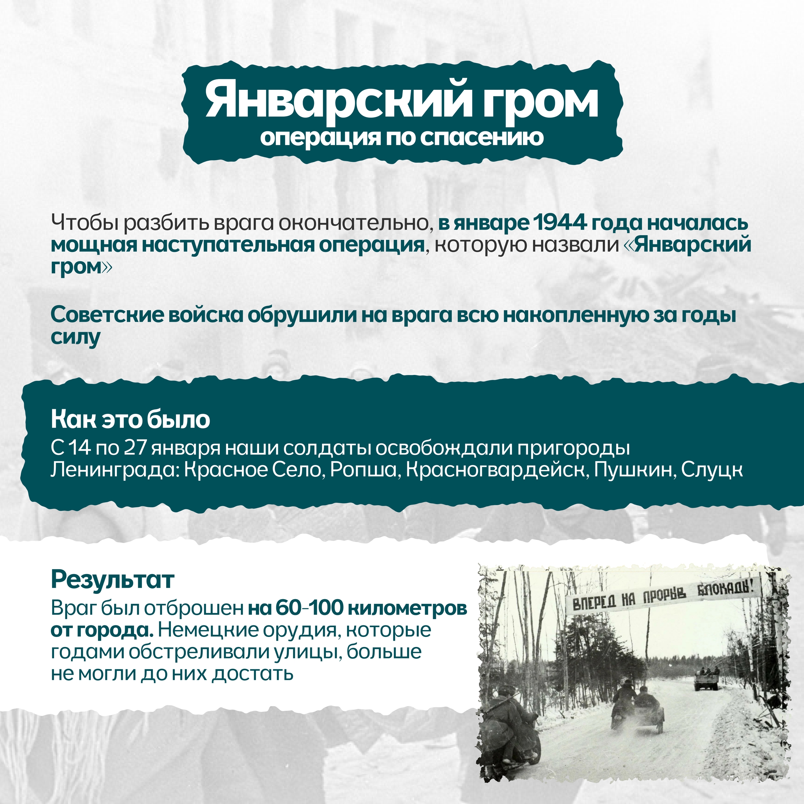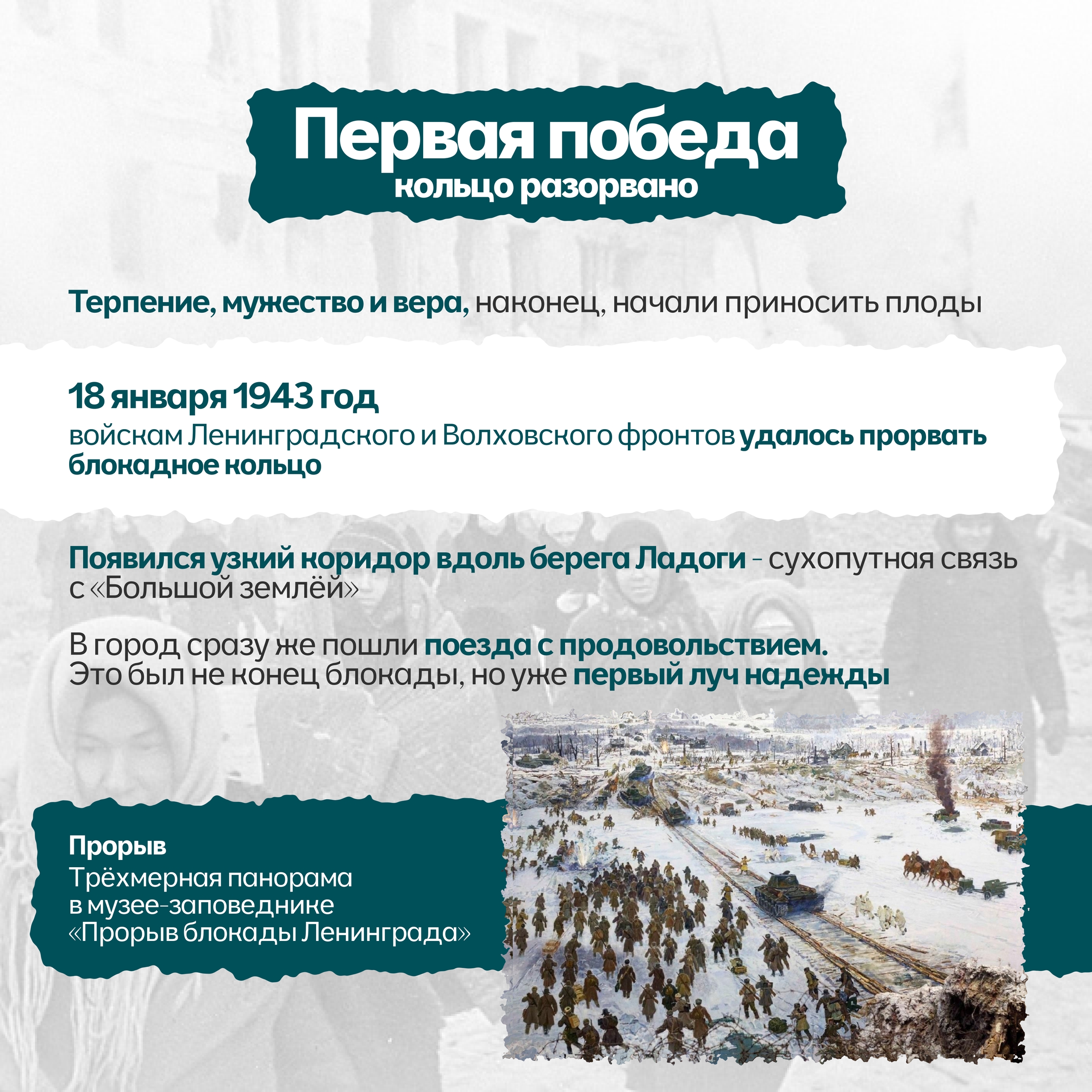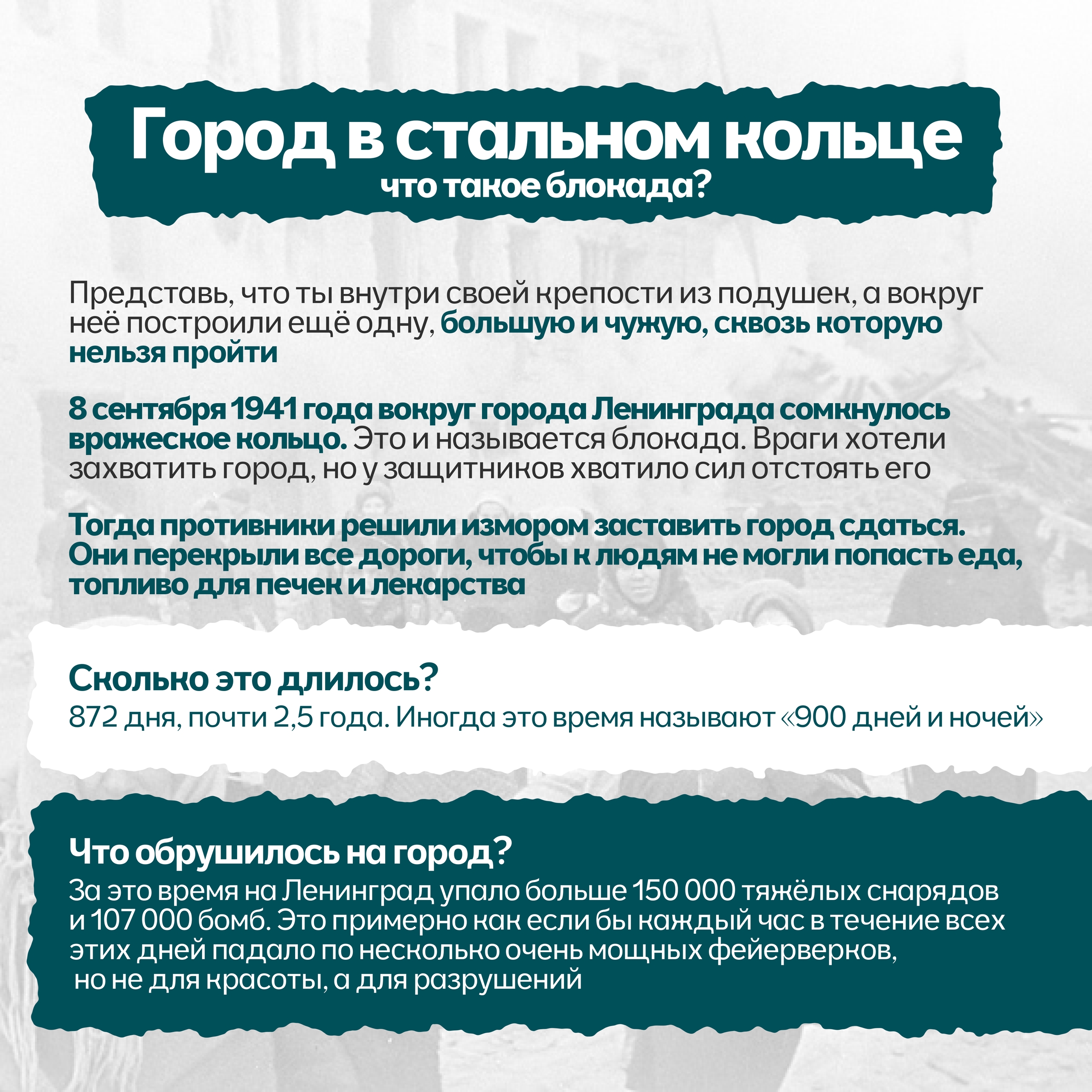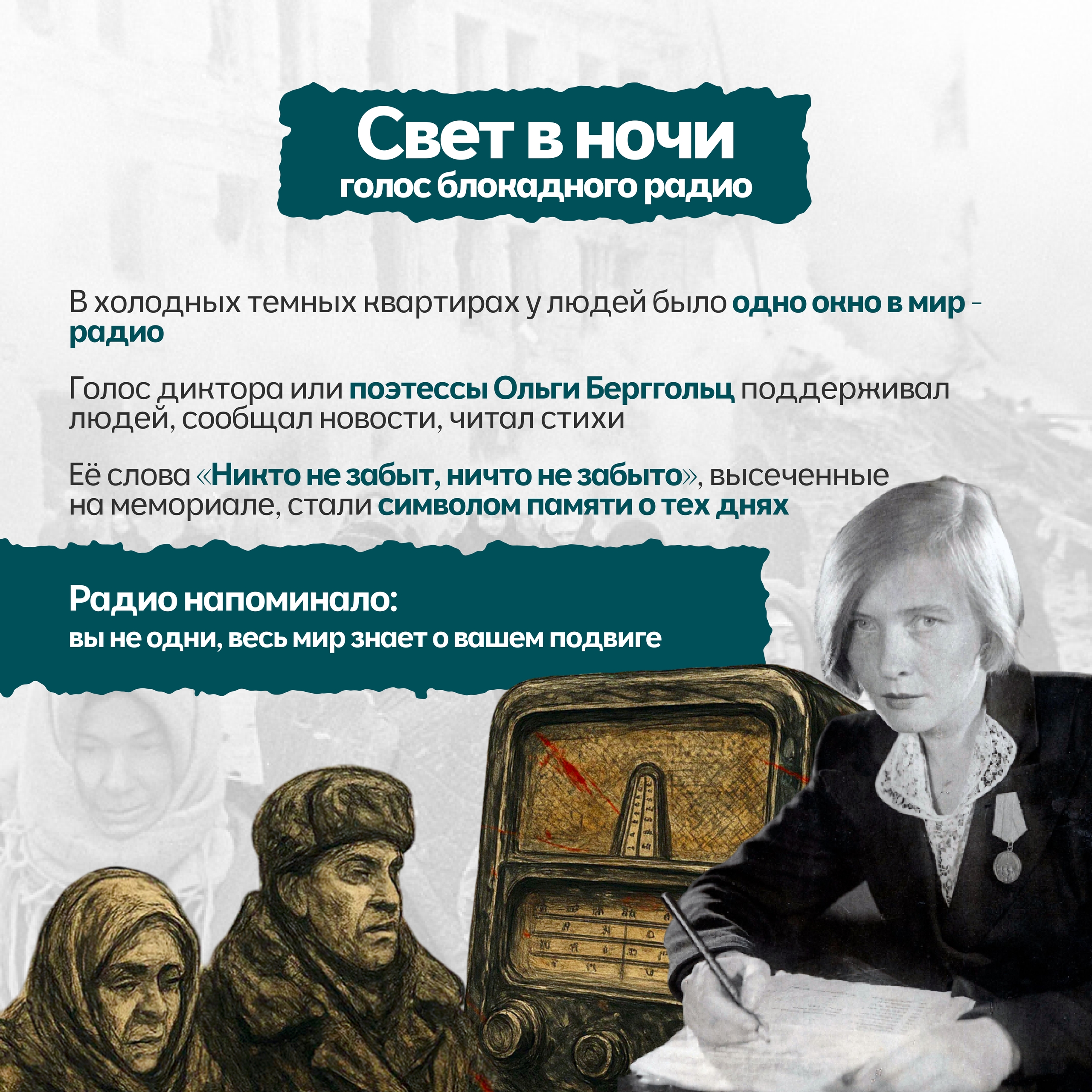 900 дней и ночей город был отрезан от мира. 900 дней голода, холода, бомбежек и артобстрелов. Но Ленинград не сдался. Он жил, боролся и работал: заводы выпускали снаряды, ученые сохраняли коллекции, дети учились в бомбоубежищах, а поэтесса Ольга Берггольц своими радиовыступлениями вселяла надежду, став «голосом блокадного Ленинграда».